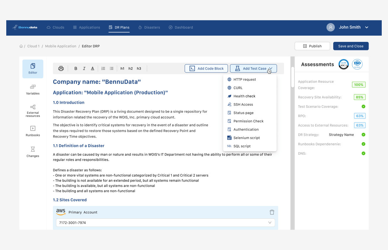 In addition to changing the game for the DR solution, the Bennudata Disaster Recovery Automation for Cloud Applications significantly improves the DR plan and script generation and update capabilities to easily and quickly generate the plans and scripts. Additionally, the solution ensures that the plans, scripts, and associated documentation are always up-to-date.